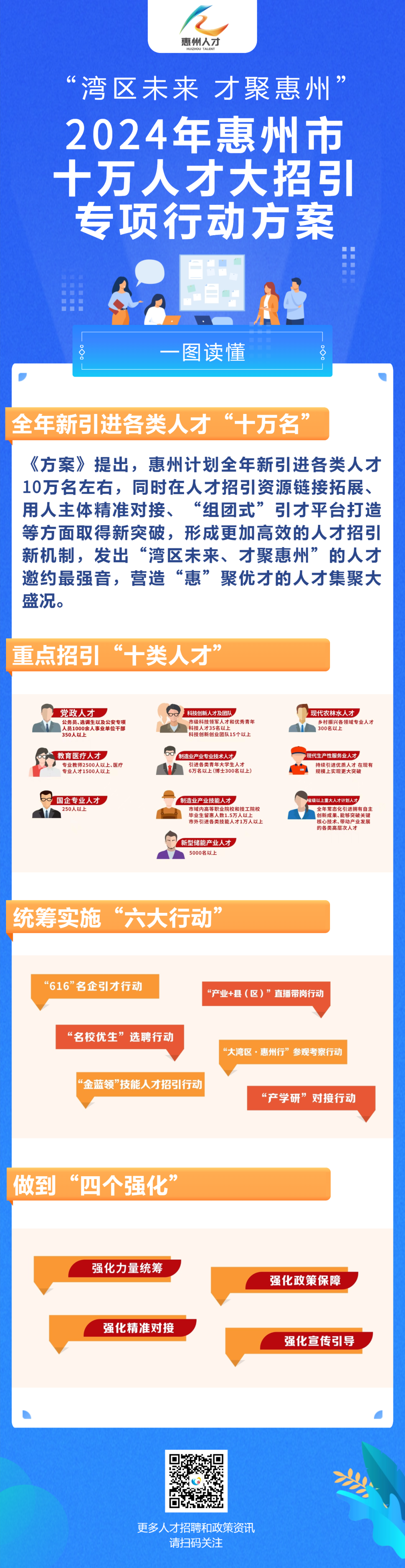 活动现场发布了“湾区未来 才聚惠州”2024年惠州市十万人才大招引专项行动方案,重点实施六大引才行动,大规模吸引集聚我市“2+1”现代产业集群、“百千万工程”急需紧缺优秀人才来惠创新创业,全年计划新引进各类人才10万名左右,营造“惠”聚优才的人才集聚盛况。